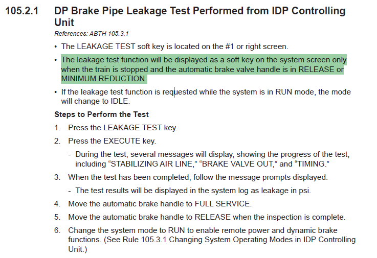 Answer: Stopped; Release or Minimum ReductionFeedback: The Air Flow method is the preferred method to use when conducting a brake pipe leakage test. If it is necessary to use the Brake Pipe Leakage Method, the acceptable leakage amount is under 5 psi. The leakage test does not have to be performed each time the train stops. That requirement falls under ABTH 105.5 Train Check.